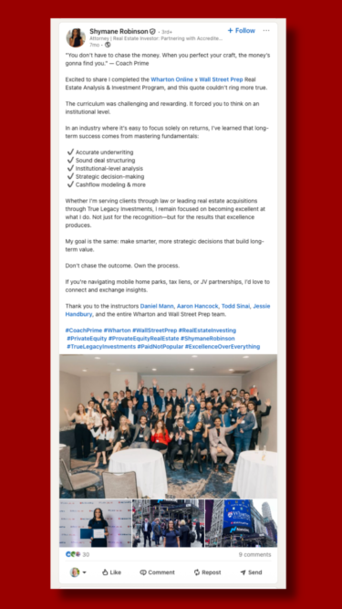 - Invitation-only LinkedIn and Slack groups where graduates exchange models, deal decks, off-market leads, capital sources, co-GP opportunities, and hiring updates for acquisitions, development, and asset management roles.